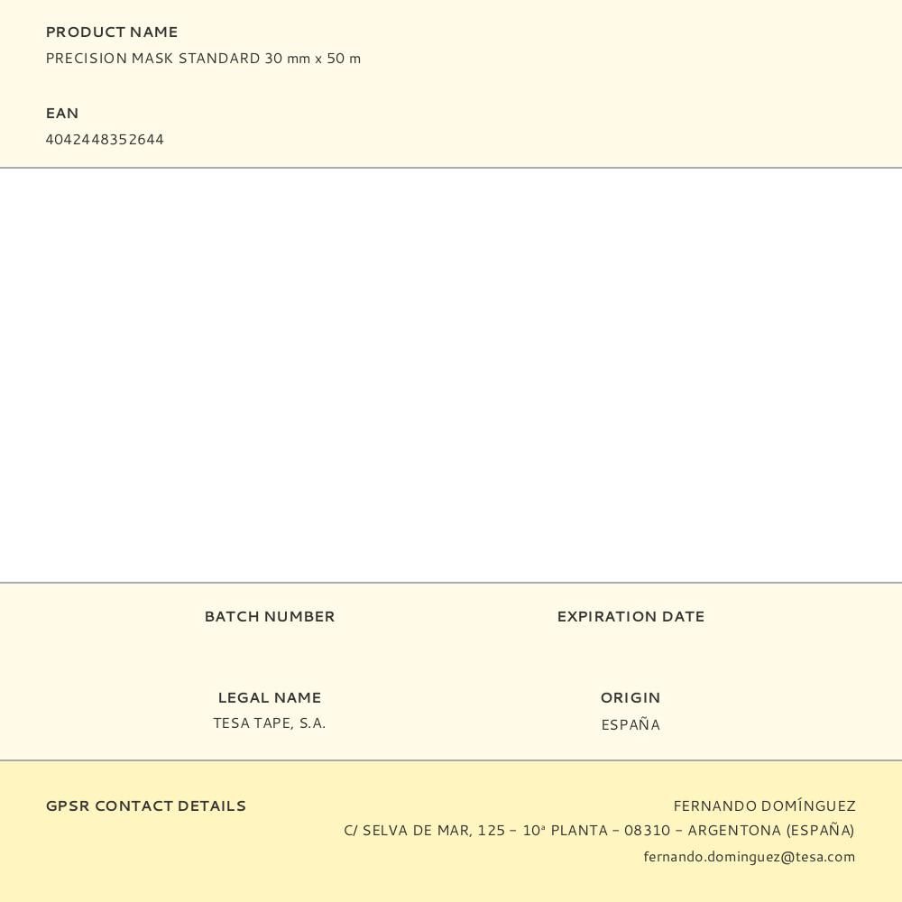 PRECISION MASK STANDARD 30 mm x 50 m, ESTÁ COMPUESTA DE UN SOPORTE DE PAPEL EXTRAFINO PERO A SU VEZ MUY RESISTENTE Y CON UN ADHESIVO ACRÍLICO