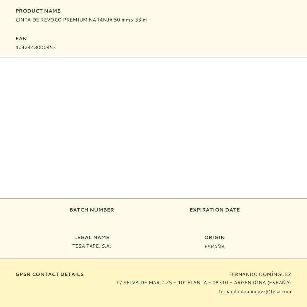 CINTA DE REVOCO PREMIUM NARANJA 50 mm x 33 m. APTO PARA LOS TRABAJOS EN EL EXTERIOR. FORMADA POR UN FILM DE PVC RESISTENTE A LA ROTURA Y CUBIERTO CON UNA CAPA DE ADHESIVO DE CAUCHO NATURAL RESISTENTE AL ENVEJECIMIENTO. PROTEGE CONTRA LA HUMEDAD, EL FRÍO, SOLUCIONES ALCALINAS DÉBILES, ÁCIDOS Y OTROS MUCHOS AGENTES QUÍMICOS