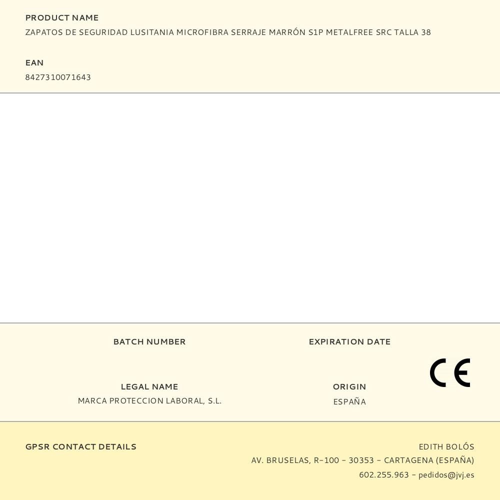 ZAPATOS DE SEGURIDAD LUSITANIA MICROFIBRA SERRAJE MARRÓN S1P METALFREE SRC TALLA 38