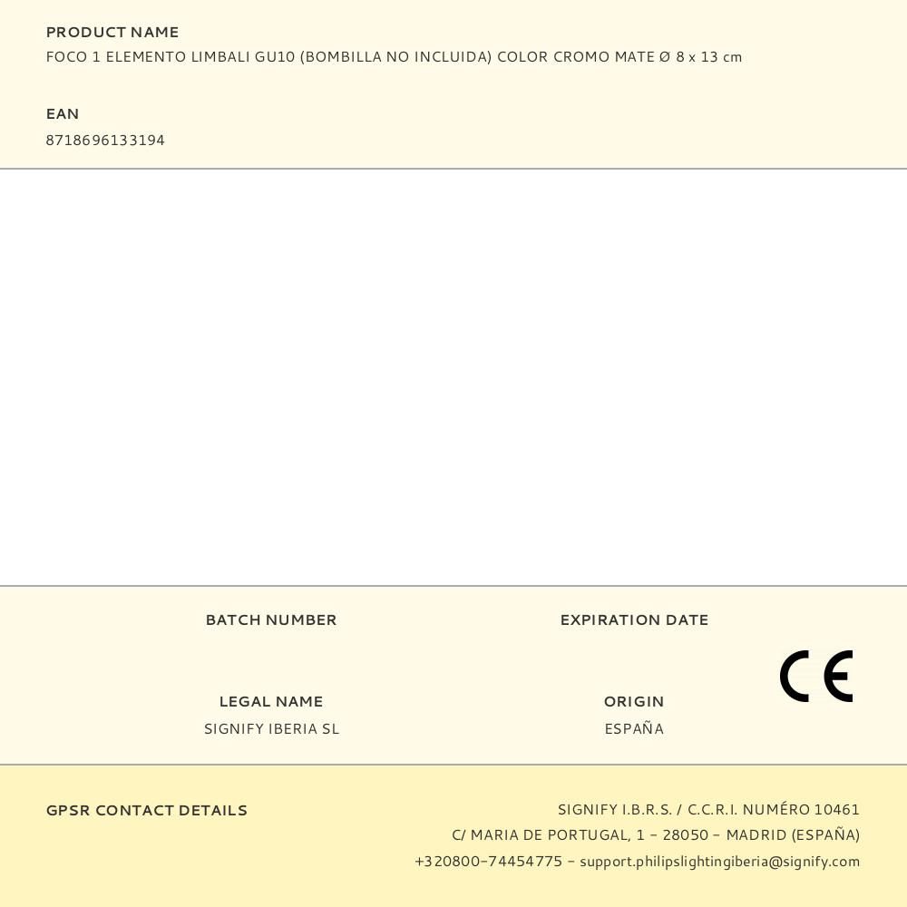 FOCO 1 ELEMENTO GU10 MOD. LIMBALI. BOMBILLAS NO INCLUIDAS, CABEZAL DE FOCO AJUSTABLE, TAMAÑO: Ø8x13cm (diámetro/alto) GRADO DE PROTECCION: IP20. 220-240V PHILIPS