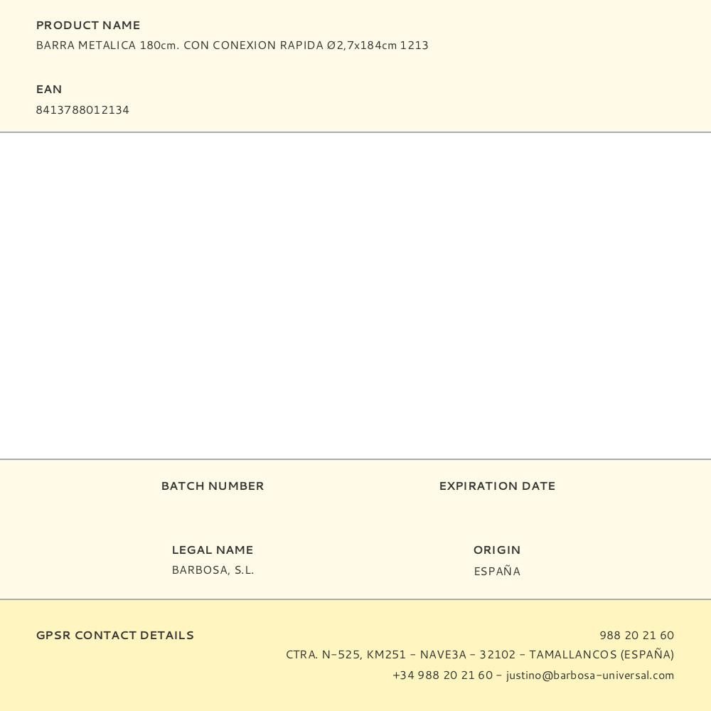 BARRA METÁLICA CON CONEXIÓN RÁPIDA 1213, Ø2,7 x 184 cm