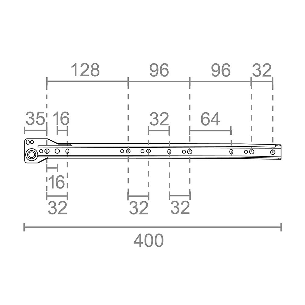 JUEGO DE GUIA 400mm. DIMENSIONES: 10x35mm (ancho/alto). EN ACERO. PARA CAJÓN CON SISTEMA ESTANDAR DE FIJACIÓN CON TORNILLOS. GUIAS DE EXTRACCIÓN PARCIAL. MARGEN NECESARIO PARA EL MONTAJE DE 1-2mm APROXIMADAMENTE. ESPESOR DE LA CHAPA DE 1mm. ACABADO BLANCO. SOPORTA UNA CARGA MÁXIMA DE 18kg. MICEL
