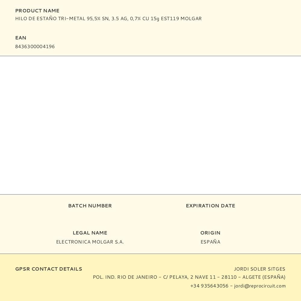 HILO DE ESTAÑO TRI-METAL 95,5% SN, 3.5 AG, 0,7% CU 15g EST119 MOLGAR. TEMPERATURA FUSIÓN ENTRE 217 Y 220°C.