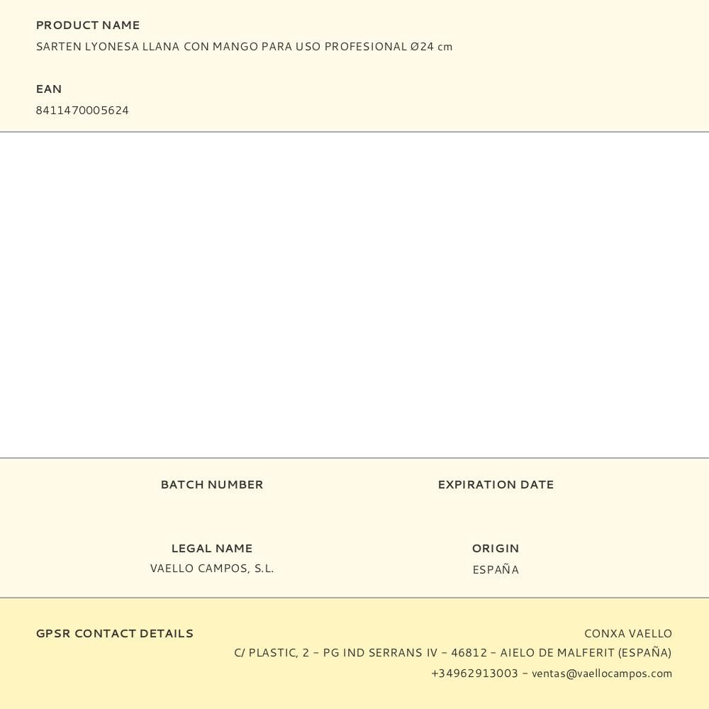 SARTÉN LYONESA LLANA CON MANGO. USO PROFESIONAL Ø24cm VAELLO. PRODUCTO FABRICADO EN ACERO LAMINADO EN FRIO. INDICADO PARA FUEGO DE LLAMA, PRINCIPALMENTE PARA SALTEAR ALIMENTOS.
