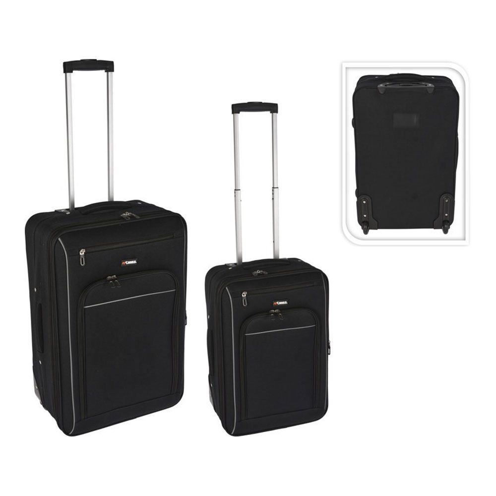 SET 2 MALETAS DE VIAJE NEGRAS. MATERIAL POLIESTER. 2 RUEDAS BASCULANTES DE TUBO DE ALUMINIO CON ASA EN PP. DOBLE BOLSILLO DELANTERO CON CREMALLERAS. DIMENSIONES: 36x24x53cm 44x26x63cm (ancho/fondo/alto)