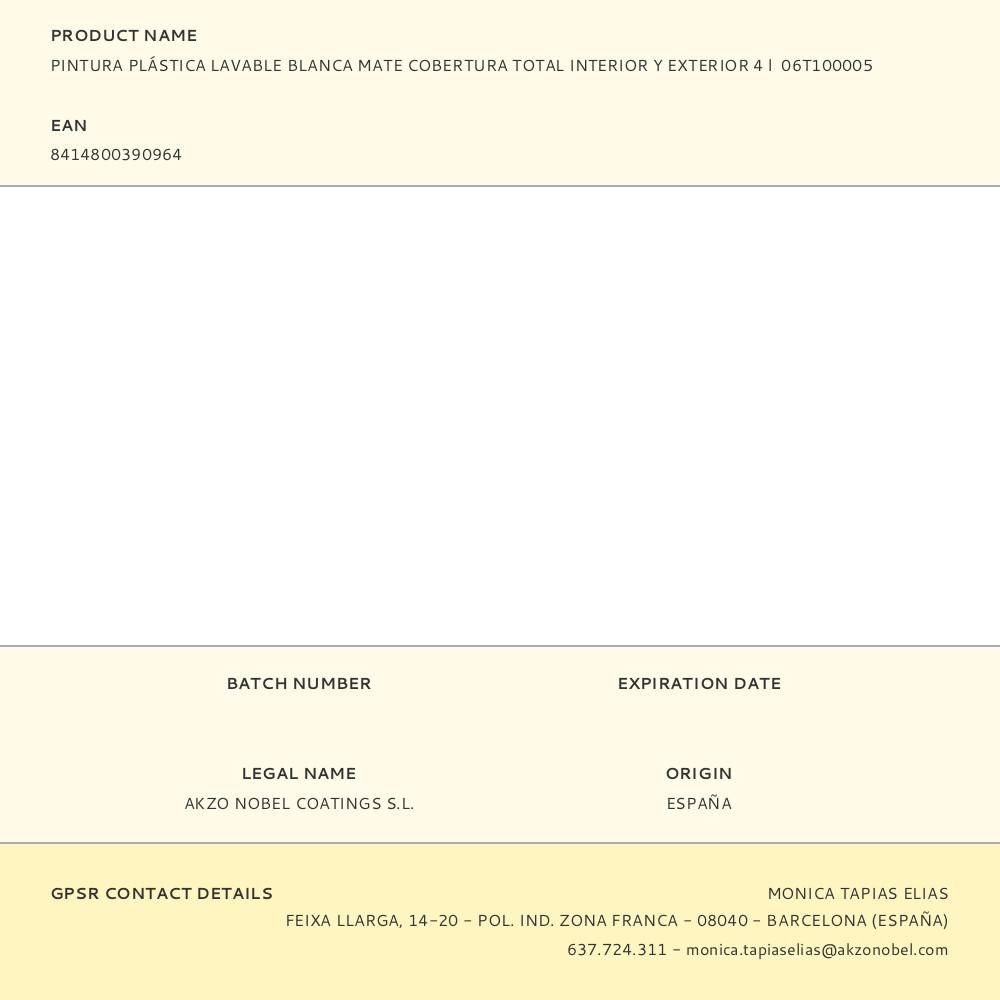 PINTURA PLÁSTICA VINÍLICA VEOVA INTERIOR/EXTERIOR ECO LAVABLE COBERTURA TOTAL BLANCO MATE 4 L. QUE CUBRE CON UNA SOLA CAPA. DECORA PAREDES Y TECHOS CON UN ACABADO DE CALIDAD Y MUY RESISTENTE. SIN OLOR. NO GOTEA. CON CONSERVANTE ANTI-MOHO. RESPETUOSO CON EL MEDIO AMBIENTE