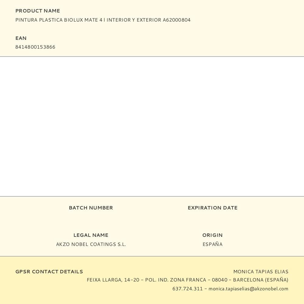 PINTURA PLÁSTICA ACRÍLICA ESTIRENADA INTERIOR/EXTERIOR ANTIMOHO BIOLUX BLANCO MATE 4 L
