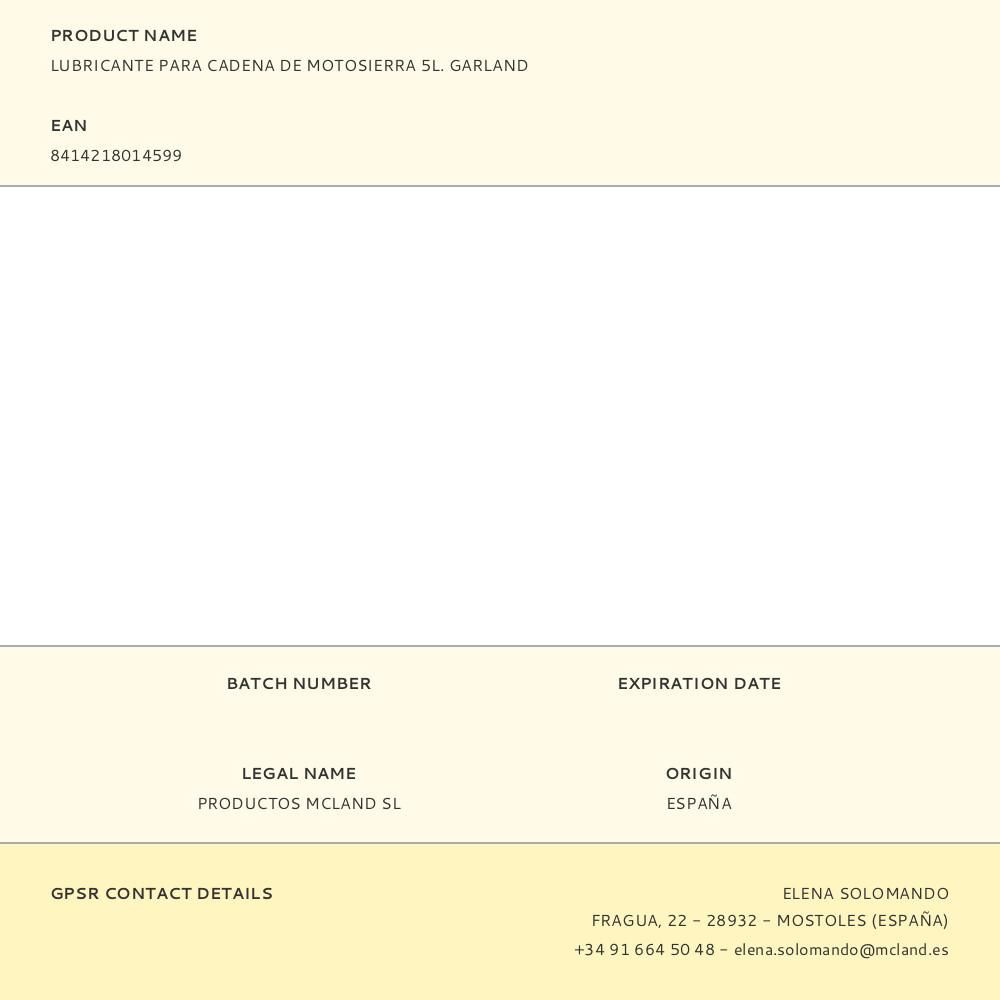 LUBRICANTE PARA CADENA DE MOTOSIERRA 5L. GARLAND. FORMULADO ESPECIALMENTE PARA UNA LUBRICACIÓN ÓPTIMA DE LA CADENA, PROPORCIONANDO UN CORTE UNIFORME Y UNA MAYOR VIDA ÚTIL DE LA MÁQUINA.