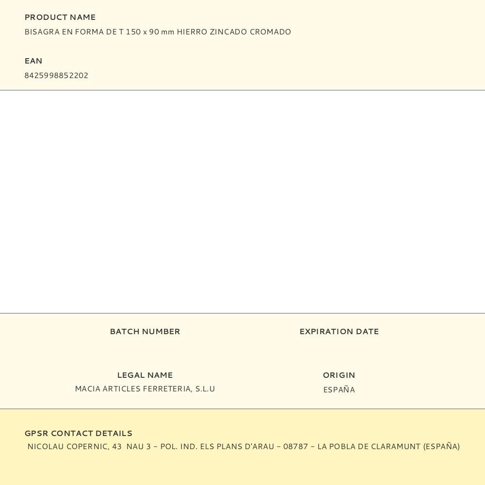 BISAGRA EN FORMA DE T 150 x 90 mm HIERRO ZINCADO CROMADO