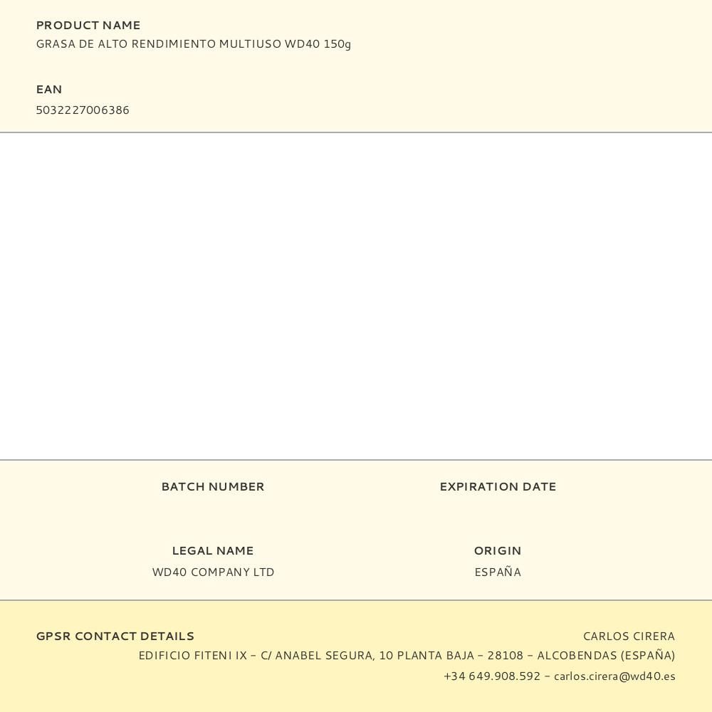 GRASA DE ALTO RENDIMIENTO MULTIUSO WD40 TUBO 150g. CON SULFONATO DE CALCIO. LUBRICA Y PROTEGE DE LA CORROSIÓN Y LA HUMEDAD, RESISTENTE A ALTAS CARGAS.