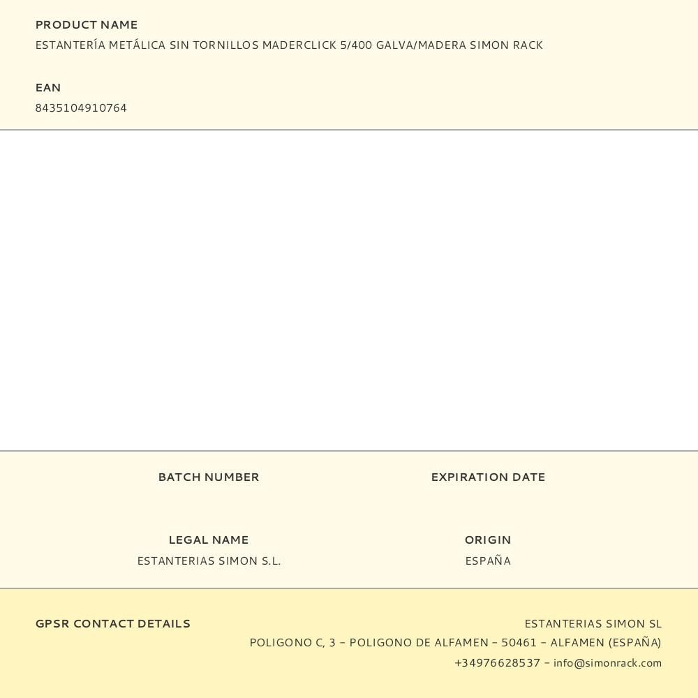 ESTANTERÍA METÁLICA SIN TORNILLOS MADERCLICK 5/400 GALVA/MADERA SIMON RACK. ESTANTERÍA METÁLICA SIN TORNILLOS DE COLOR GALVA/MADERA CON CAPACIDAD DE CARGA POR ESTANTE DE 150kg. EL NÚMERO DE ESTANTES ES 5 Y LAS MEDIDAS: 1800x900x400mm (ancho/alto/fondo) TIENE ESTANTES DE AGLOMERADO DE 12mm. PRODUCTO ESPAÑOL DE CALIDAD EUROPEA. MEDIDAS EN USO DEL PRODUCTO: 1787x877x410mm (ancho/alto/fondo)