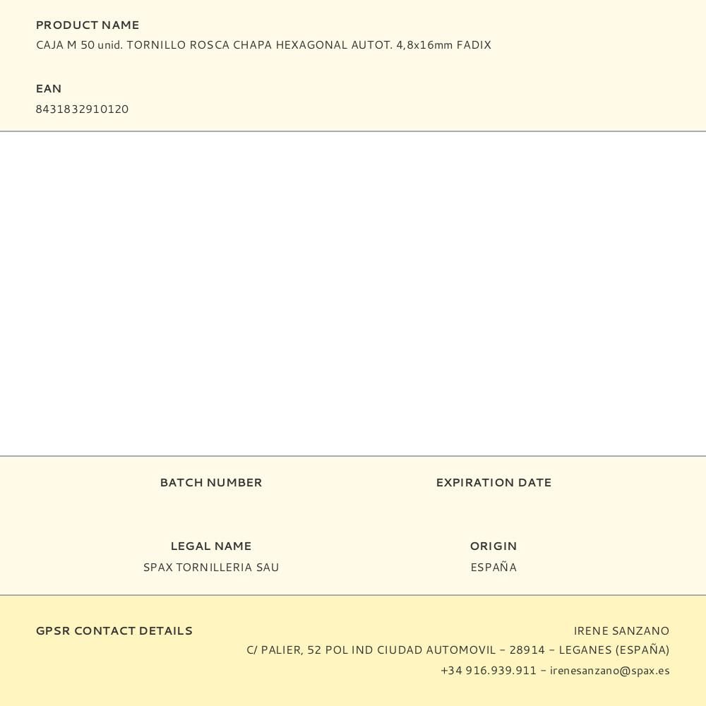 CAJA M 50 unid. TORNILLO ROSCA CHAPA HEXAGONAL AUTOT. 4,8x16mm FADIX