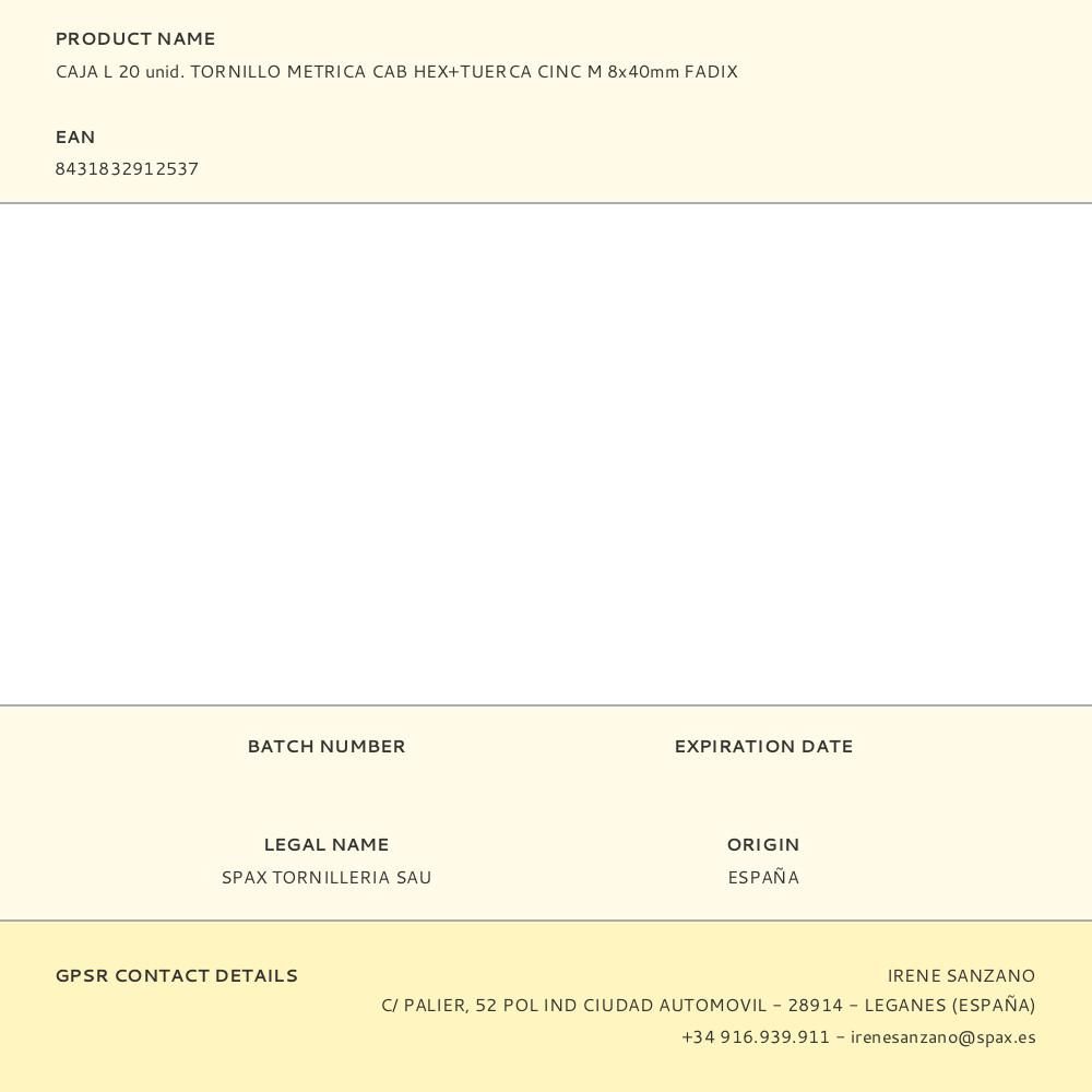CAJA L 20 unid. TORNILLO METRICA CAB HEX+TUERCA CINC M 8x40mm FADIX