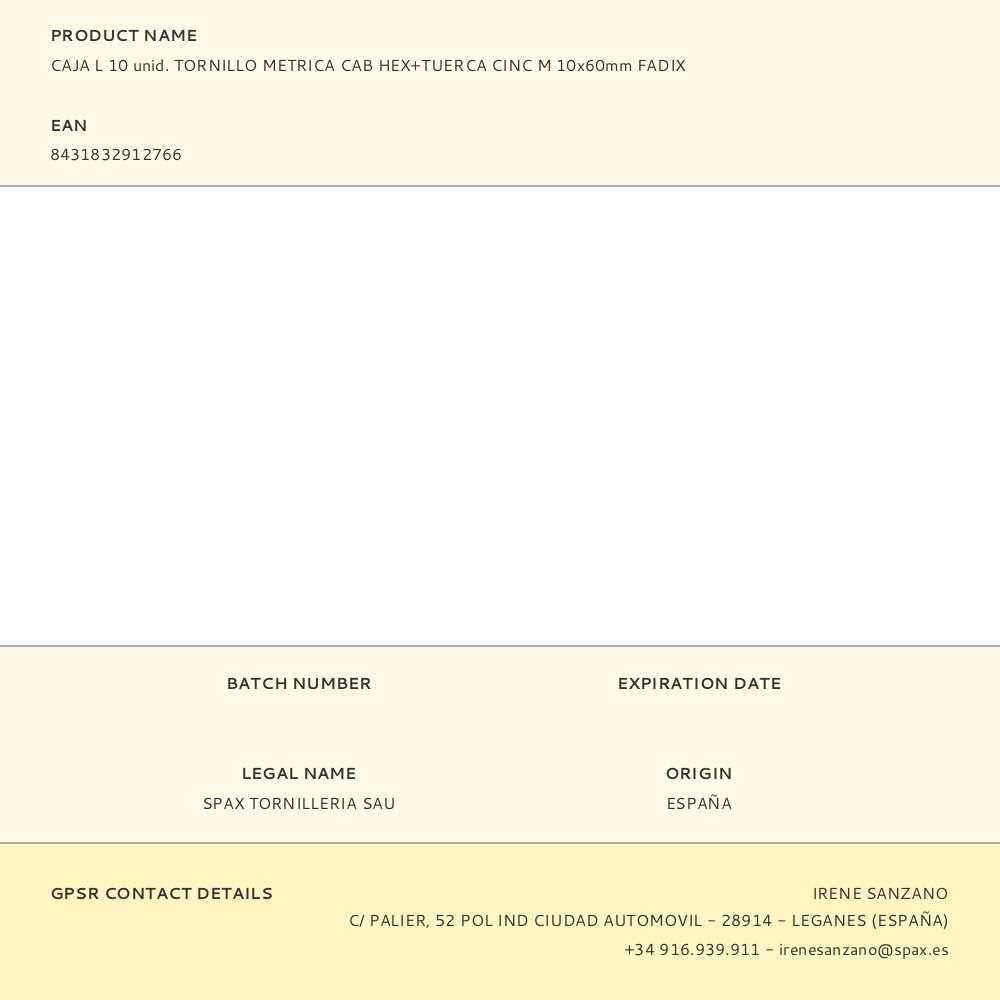 CAJA L 10 unid. TORNILLO METRICA CAB HEX+TUERCA CINC M 10x60mm FADIX