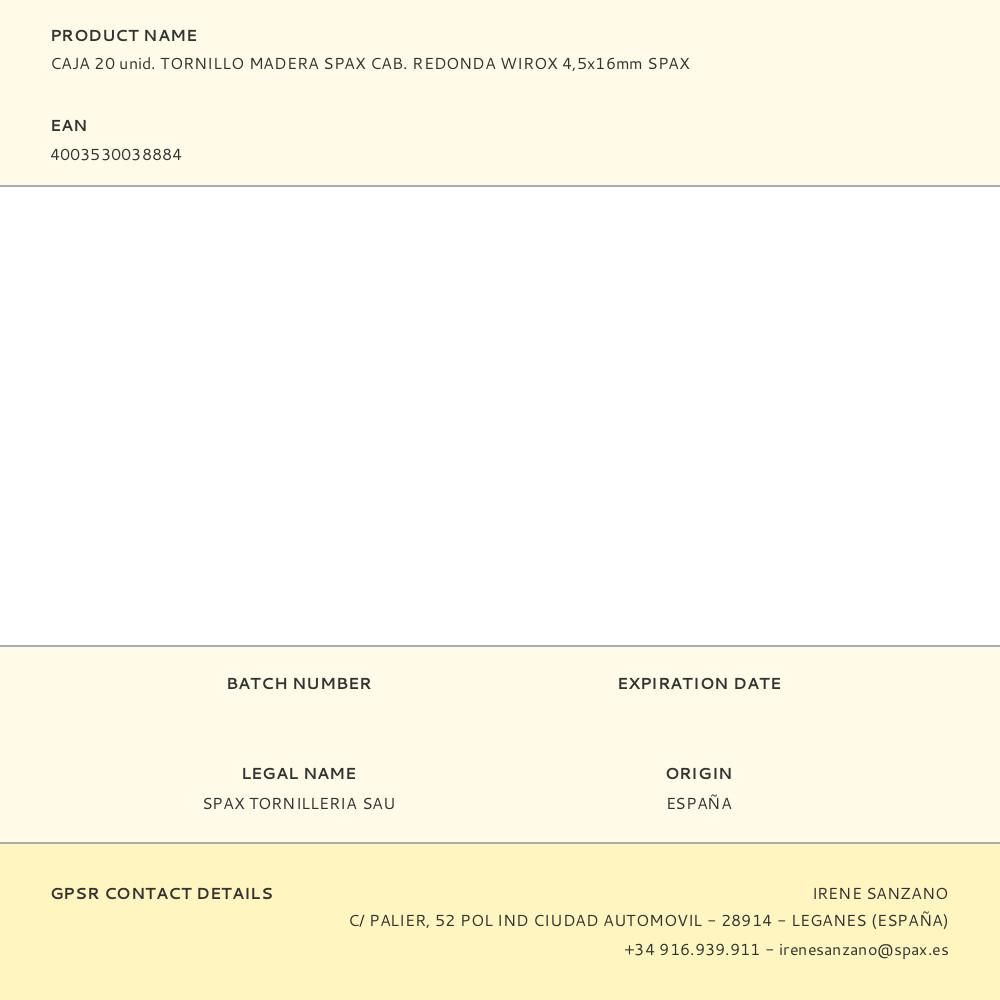 CAJA 20 unid. TORNILLO MADERA SPAX CAB. REDONDA WIROX 4,5x16mm SPAX