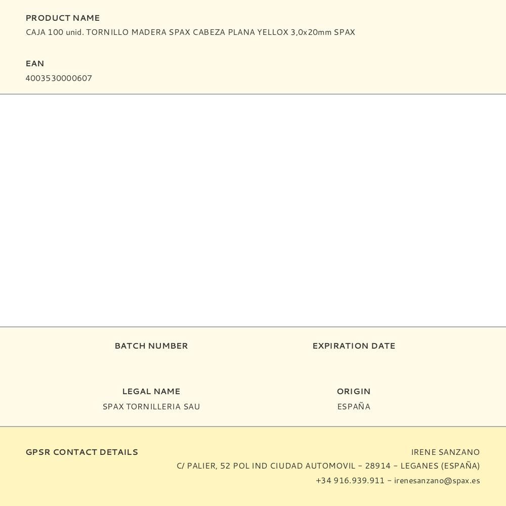 CAJA 100 unid. TORNILLO MADERA SPAX CABEZA PLANA YELLOX 3,0x20mm SPAX. TORNILLO UNIVERSAL, ROSCA COMPLETA, CABEZA PLANA, RANURA EN CRUZ Z1, PUNTA S, YELLOX - 4081020300202
