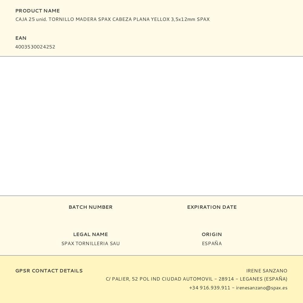 CAJA 25 unid. TORNILLO MADERA SPAX CABEZA PLANA YELLOX 3,5x12mm SPAX