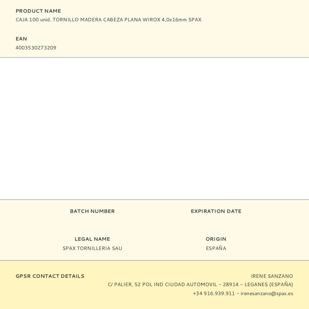 CAJA 100 unid. TORNILLO MADERA CABEZA PLANA WIROX 4,0x16mm SPAX. SIN NECESIDAD DE PERFORACIÓN PREVIA (EN FUNCIÓN DE LA MADERA) - MECANIZADO RÁPIDO Y SEGURO CON POCO ESFUERZO (MAYOR CANTIDAD DE ATORNILLADOS CON UNA CARGA DE LA BATERÍA) - APLICACIÓN UNIVERSAL - REDUCE DE FORMA EFICIENTE LA ROTURA DEL MATERIAL DE MADERA, INCLUSO CON DISTANCIAS REDUCIDAS DE LOS BORDES