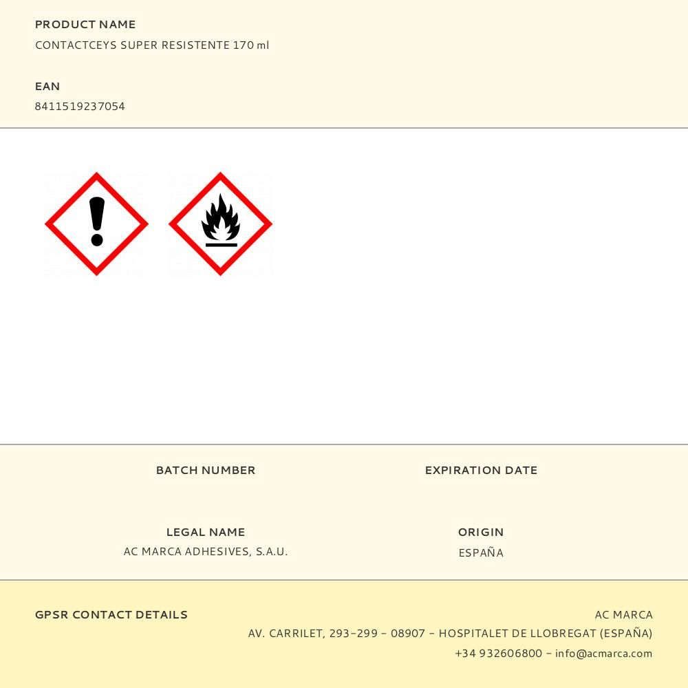 CONTACTCEYS SUPER RESISTENTE 170 ml . COLA DE CONTACTO, EN BASE NEOPRENO, MUY POLIVALENTE Y DE USO GENERAL, PARA UNIR MULTITUD DE MATERIALES - EN ESPECIAL PROPORCIONA INMEJORABLES RESULTADOS PARA PEGAR CUERO, MADERA, FÓRMICA, GOMA, CORCHO, ENTRE SÍ O COMBINADOS CON OTROS MATERIALES.