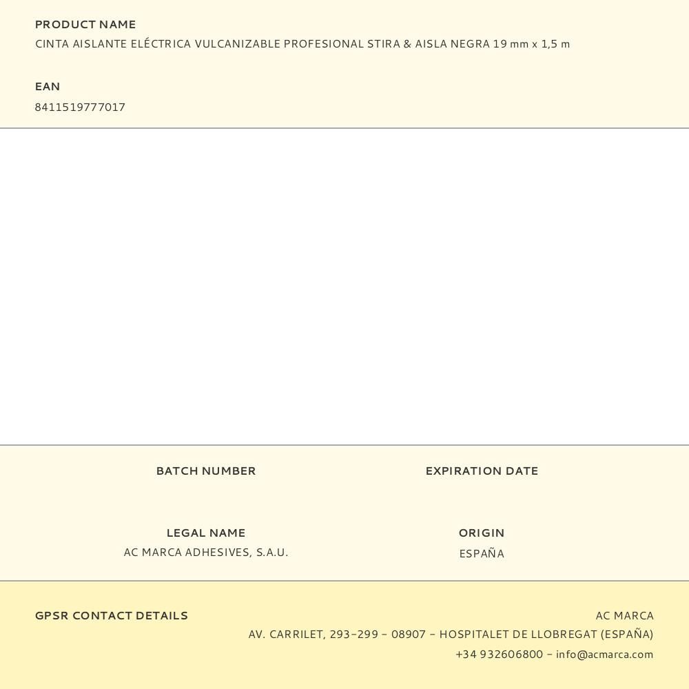 CINTA AISLANTE ELÉCTRICA VULCANIZABLE PROFESIONAL STIRA & AISLA NEGRA 19 mm x 1,5 m