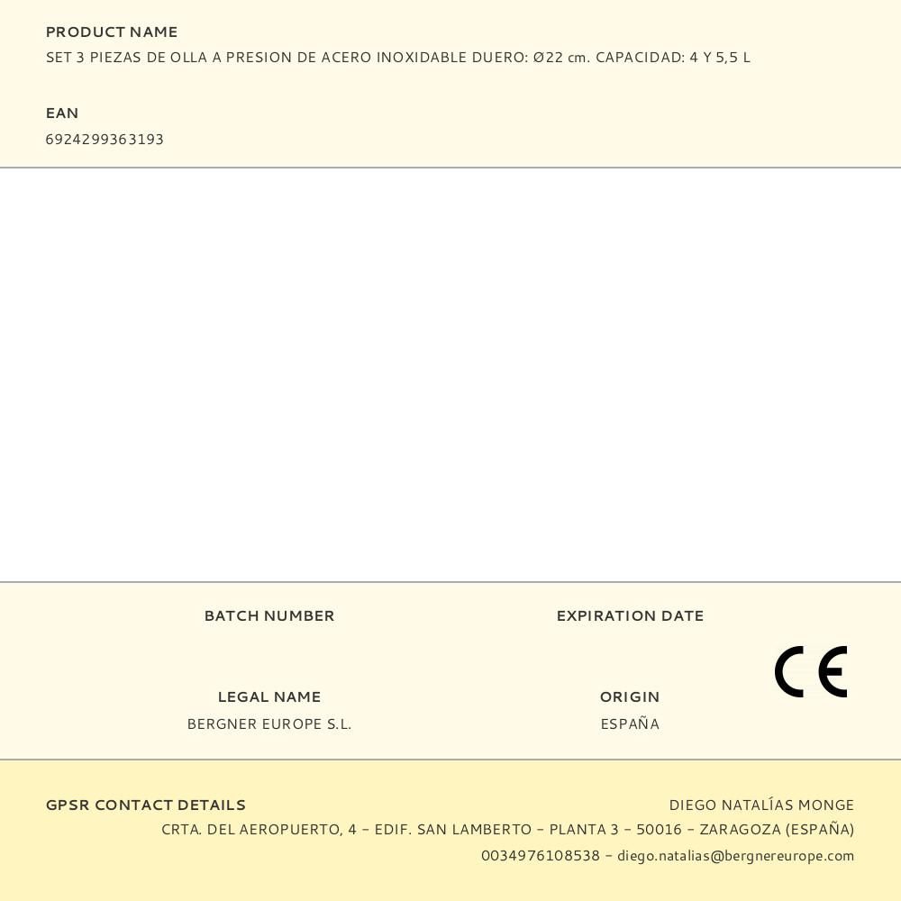 SET 3 PIEZAS. Ø22cm 4+5,5L OLLA A PRESION ACER INOXIDABLE 1mm DE GROSOR DUERO SG1530 SAN IGNACIO. AMPLIA VARIEDAD DE TAMAÑOS. CADA CACEROLA DEL SET CUENTA CON DISTINTAS DIMENSIONES QUE SE ENCARGAN DE AMPLIAR LOS USOS DENTRO DE LA COCINA. NO OBSTANTE, NO POSEEN UN TAMAÑO EXAGERADO. MECANISMO DE INDUCCIÓN MUY EFICIENTE. EL SISTEMA DE OLLA RÁPIDA QUE POSEE CADA PIEZA SE ENCARGA DE FACILITAR LA COCCIÓN DE LOS ALIMENTOS GRACIAS A LA CONDUCCIÓN PROPORCIONAL DEL CALOR. TAMAÑO PRÁCTICO. LA OLLA EXPRESS DE 6 LITROS PERMITE UN AMPLIO ALMACENAJE DE ALIMENTOS, ESTO FAVORECE A LA EFICIENCIA A LA HORA DE COCINAR DURANTE UN CORTO PERIODO DE TIEMPO. FABRICADO EN ACERO INOXIDABLE. CADA PIEZA DEL SET ESTÁ FABRICADA CON ESTE MATERIAL, LO QUE GARANTIZA SU DURABILIDAD Y AYUDA A MANTENER EL ESTADO DE LOS ALI...