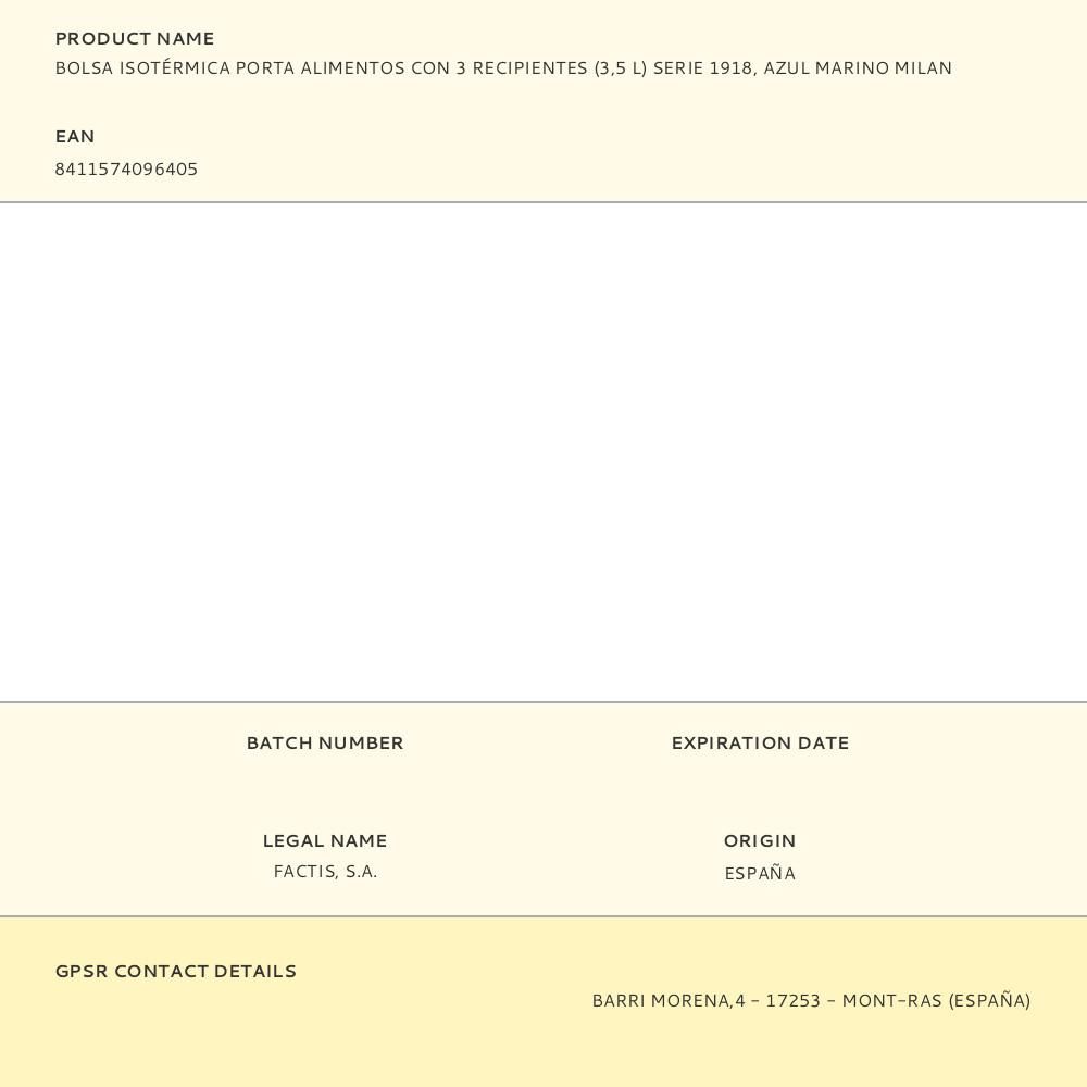 BOLSA ISOTÉRMICA PORTA ALIMENTOS SERIE 1918 AZUL MARINO CON 3 RECIPIENTES 3,5 L. CONTIENE 3 RECIPIENTES: UN RECIPIENTE CUADRADO BLANCO, UN RECIPIENTE RECTANGULAR CON TAPA AZUL MARINO Y UN RECIPIENTE REDONDO AZUL MARINO HERMÉTICO (CON TAPA ROSCADA). INTERIOR AISLANTE TÉRMICO (FRÍO/CALOR) PARA UNA MEJOR CONSERVACIÓN DE LOS ALIMENTOS. APERTURA TOTAL PARA UNA MEJOR ACCESIBILIDAD Y LIMPIEZA. PRÁCTICO BOLSILLO INTERIOR CON CREMALLERA. CORREA REGULABLE Y EXTRAÍBLE. TEJIDO EXTERIOR 'RIPSTOP': LIGERO Y RESISTENTE A LA ROTURA Y RASGADURAS. UTILIZA UNA TÉCNICA ESPECIAL QUE TEJE HILOS GRUESOS DE REFUERZO A INTERVALOS REGULARES EN UN PATRÓN ENTRECRUZADO. COMPOSICIÓN TEJIDO: EXTERIOR DE POLIÉSTER Y FORRO INTERIOR ISOTÉRMICO (P.E.V.A.). MEDIDAS:23 x 20 x 11 cm. CAPACIDAD: 3,5 LITROS