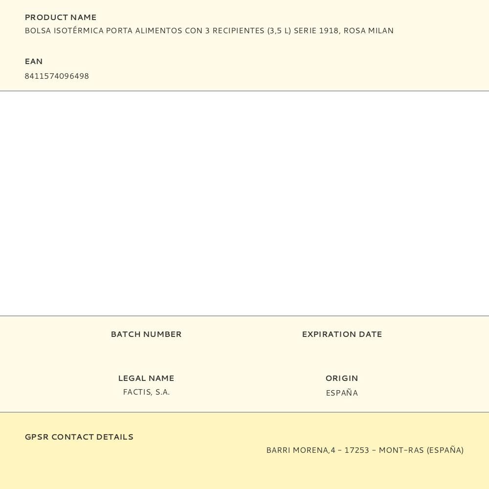 BOLSA ISOTÉRMICA PORTA ALIMENTOS SERIE 1918 ROSA CON 3 RECIPIENTES 3,5 L. CONTIENE 3 RECIPIENTES: UN RECIPIENTE CUADRADO ROSA, UN RECIPIENTE RECTANGULAR CON TAPA ROSA Y UN RECIPIENTE REDONDO ROSA HERMÉTICO (CON TAPA ROSCADA). INTERIOR AISLANTE TÉRMICO (FRÍO/CALOR) PARA UNA MEJOR CONSERVACIÓN DE LOS ALIMENTOS. APERTURA TOTAL PARA UNA MEJOR ACCESIBILIDAD Y LIMPIEZA. PRÁCTICO BOLSILLO INTERIOR CON CREMALLERA. CORREA REGULABLE Y EXTRAÍBLE. TEJIDO EXTERIOR 'RIPSTOP': LIGERO Y RESISTENTE A LA ROTURA Y RASGADURAS. UTILIZA UNA TÉCNICA ESPECIAL QUE TEJE HILOS GRUESOS DE REFUERZO A INTERVALOS REGULARES EN UN PATRÓN ENTRECRUZADO. COMPOSICIÓN TEJIDO: EXTERIOR DE POLIÉSTER Y FORRO INTERIOR ISOTÉRMICO (P.E.V.A.). MEDIDAS:23 x 20 x 11 cm. CAPACIDAD: 3,5 LITROS