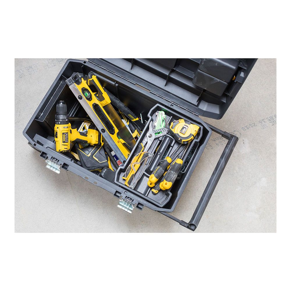ARCÓN 50 l ESSENTIAL CON ASA METÁLICA CON ZONA DE AGARRE DE PLÁSTICO. CIERRES METÁLICOS GEOMÉTRICOS CON BLOQUEO PARA MAYOR SEGURIDAD. ORGANIZADORES EN LA TAPA PARA PEQUEÑAS PIEZAS. BANDEJA INTERIOR EXTRAÍBLE PARA UNA MEJOR ORGANIZACIÓN DE LAS HERRAMIENTAS MANUALES. RUEDAS DE 18 cm PARA UN MEJOR MANEJO Y MEJOR MANIOBRABILIDAD
