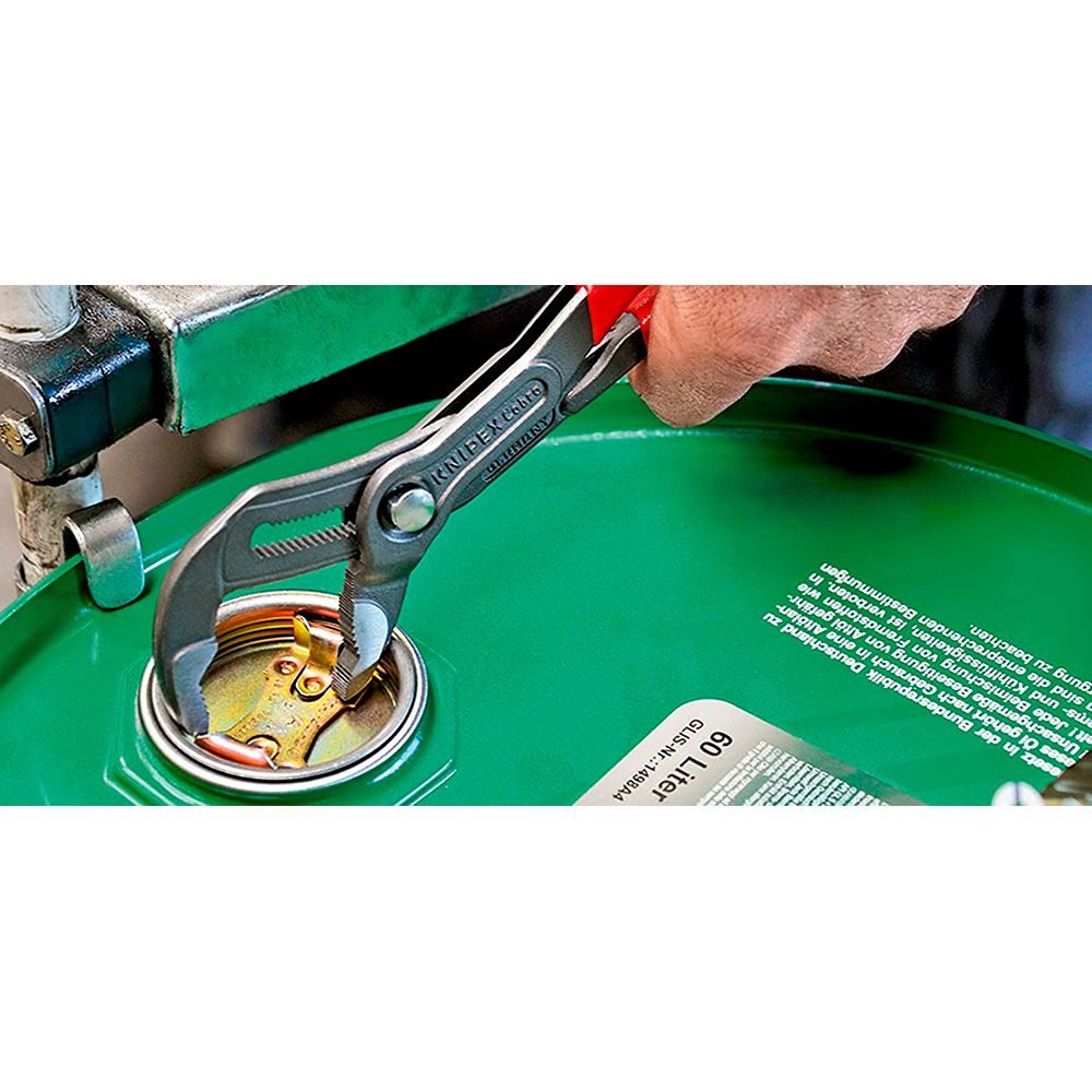 TENAZAS AJUSTABLES COBRA®. AJUSTE AUTOMÁTICO MEDIANTE PULSACIÓN DE BOTÓN DIRECTAMENTE EN LA PIEZA DE TRABAJO. AJUSTE PRECISO PARA ADAPTARSE ÓPTIMAMENTE A DIVERSOS TAMAÑOS DE PIEZAS Y PARA UNA POSICIÓN ERGONÓMICA DEL MANGO AUTO-RETENCIÓN EN TUBERÍAS Y TUERCAS, AGARRE PERFECTO A LA PIEZA CON EL MÍNIMO ESFUERZO.MORDAZAS CON DIENTES ADICIONALMENTE TEMPLADOS, DUREZA APROX. DE LOS DIENTES 61 HRC: POCO DESGASTE Y GRAN SEGURIDAD EN EL AGARRE. 240 x 44 x 14 mm