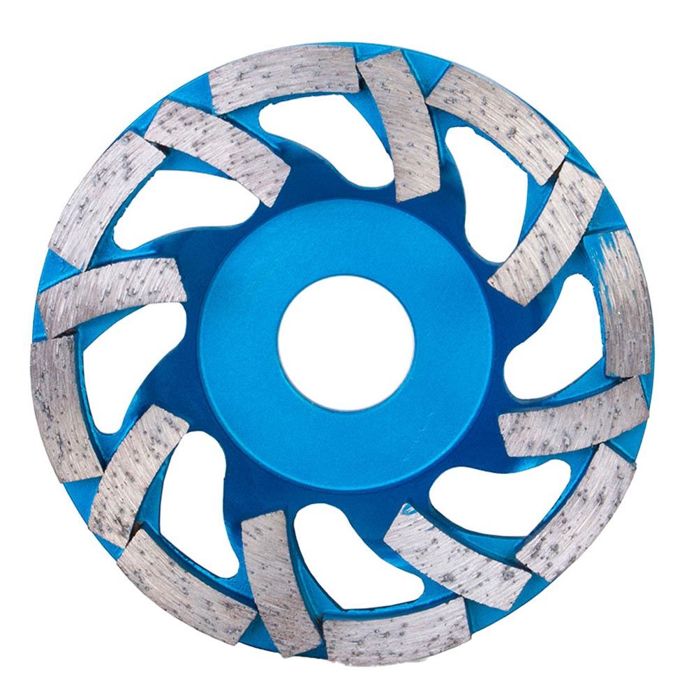 MUELA DESBASTE FAN CUP PARA HORMIGÓN Ø100 mm. LOS SEGMENTOS SINTERIZADOS SE FIJAN AL CUERPO DE ACERO, DE ALTAS PRESTACIONES, DE LA MUELA MEDIANTE LA TÉCNICA DE LA SOLDADURA LÁSER, LA MÁS FUERTE Y RESISTENTE.EL DISEÑO ESPECÍFICO DEL CUERPO DE ACERO Y LA DISPOSICIÓN PERPENDICULAR DE LOS SEGMENTOS DE DIAMANTE FACILITAN LA EVACUACIÓN DE LOS RESTOS DE MATERIAL DE DESBASTE E INCREMENTAN LA REFRIGERACIÓN DE LA MUELA DE DIAMANTE.