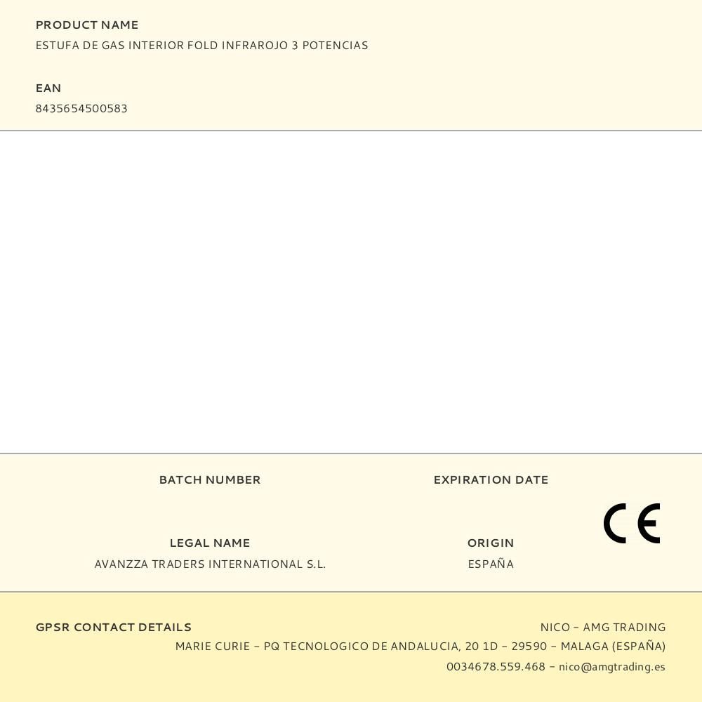 ESTUFA DE GAS PLEGABLE INTERIOR FOLD DE INFRAROJO. CON 3 POTENCIAS: BAJA 1,6 KW, MEDIA 2,8 KW Y ALTA 4,2 KW. DIMENSIONES CAJA: 71 x 16 x 44 cm