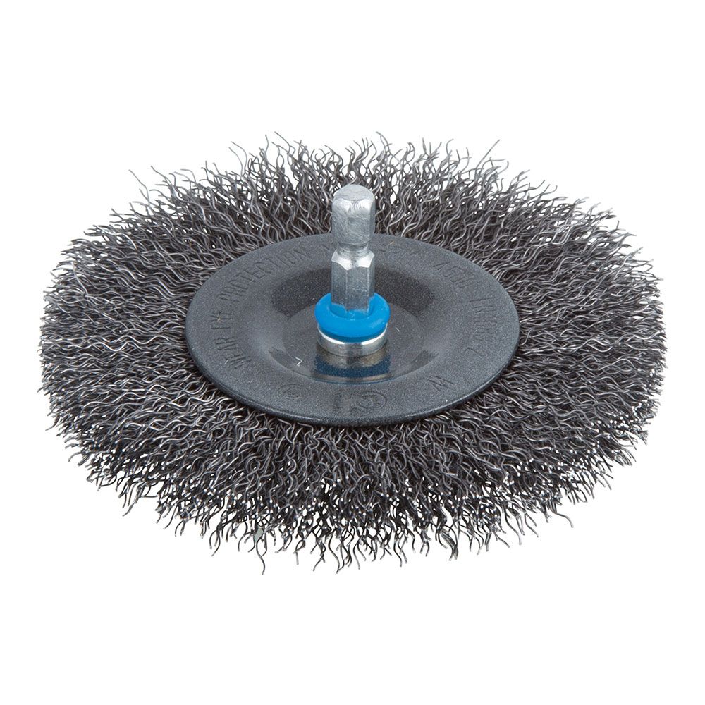 CEPILLO DE DISCO DE ALAMBRE DE ACERO - DIÁMETRO DE TRABAJO: 100 mm - ALTURA DE GUARNICIÓN: 10 mm - LONGITUD DEL ALAMBRE: 23mm - VERSIÓN DE VÁSTAGO: VÁSTAGO HEXAGONAL DE 6,35 mm, ¼ pulg - LONGITUD DE VÁSTAGO: 25 mm - DIMENSIONES: 100 x 100 x 34 mm