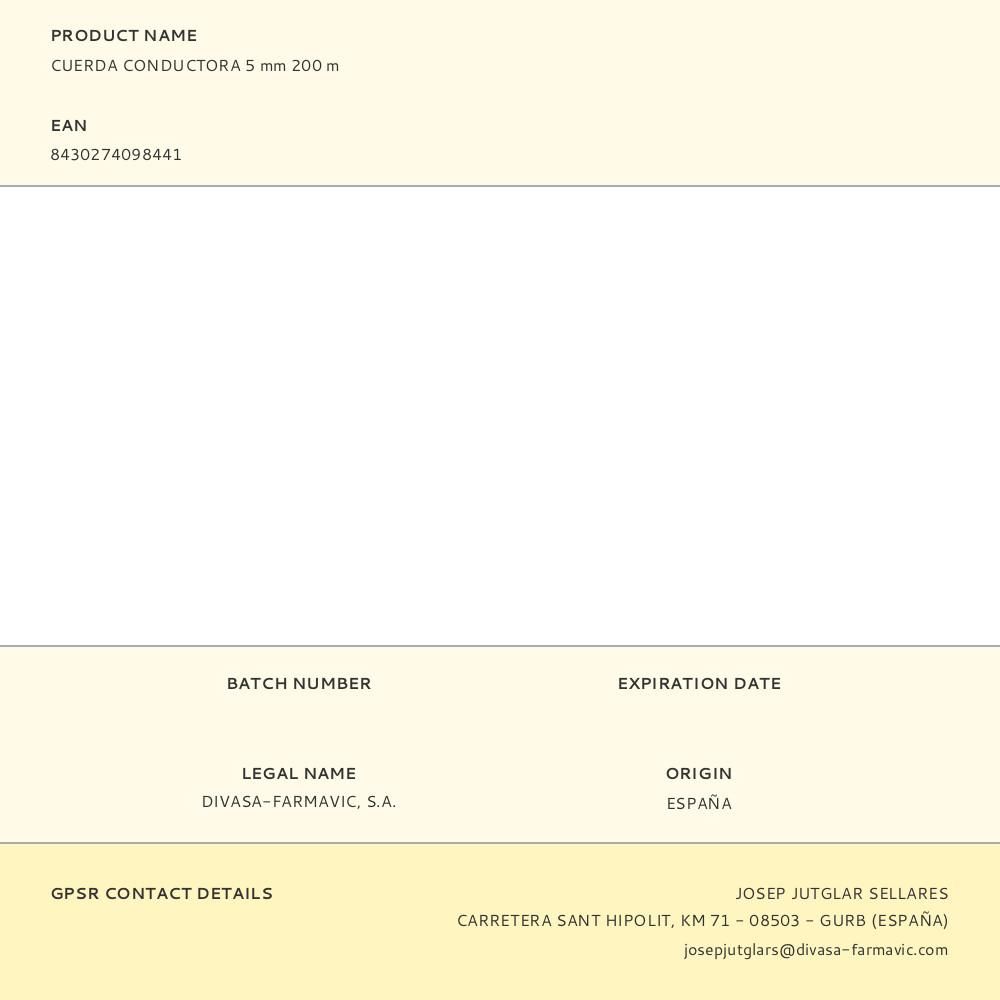 CUERDA CONDUCTORA 5mm PASTORMATIC. 3 CORDS CONDUCTORES: (0,40mm ACERO INOX.) 120 CORDS: (0,38mm) . LONGITUD 200m. RESISTENCIA ELÉCTRICA (Ohm) 1,60. CARGA ROTURA: 310kg.