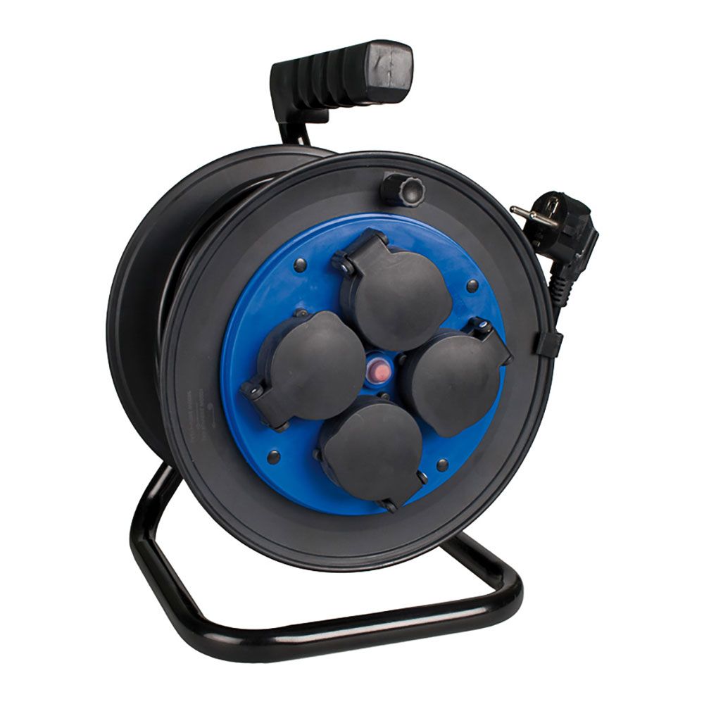 ENROLLACABLE 50m 3x1,5mm CON 4 TOMAS BIPOLARES CON T/TL CON TAPAS SOLERA. POTENCIA MAXIMA ADMISIBLE EXTENDIDO 3500W, POTENCIA MAXIMA ADMISIBLE ENROLLADO 1200W. 2P 16 A 250 V. TIPO DE CABLE H05VV-F 3x1,5mm. CON LIMITADOR DE POTENCIA. IP54 7427/1T