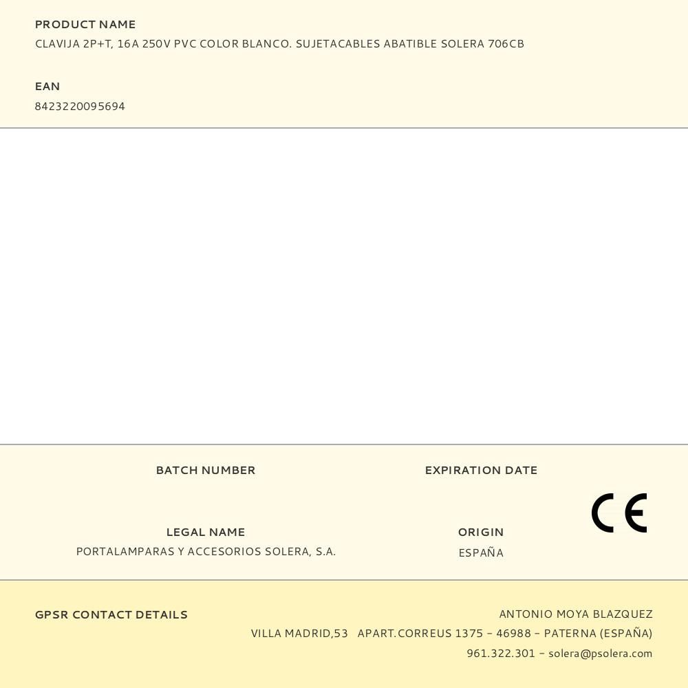 CLAVIJA 2P+T, 16A 250V PVC COLOR BLANCO. SUJETACABLES ABATIBLE SOLERA 706CB