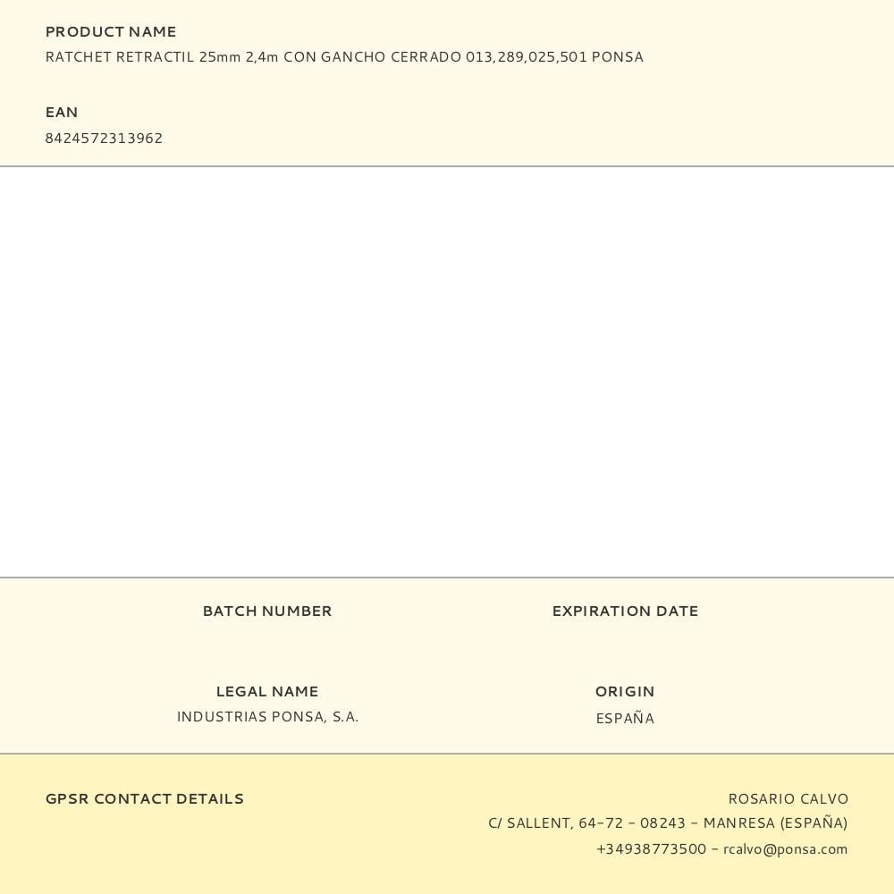 RATCHET RETRACTIL 25mm 2,4m CON GANCHO CERRADO 013,289,025,501 RESISTENCIA 500kg PONSA