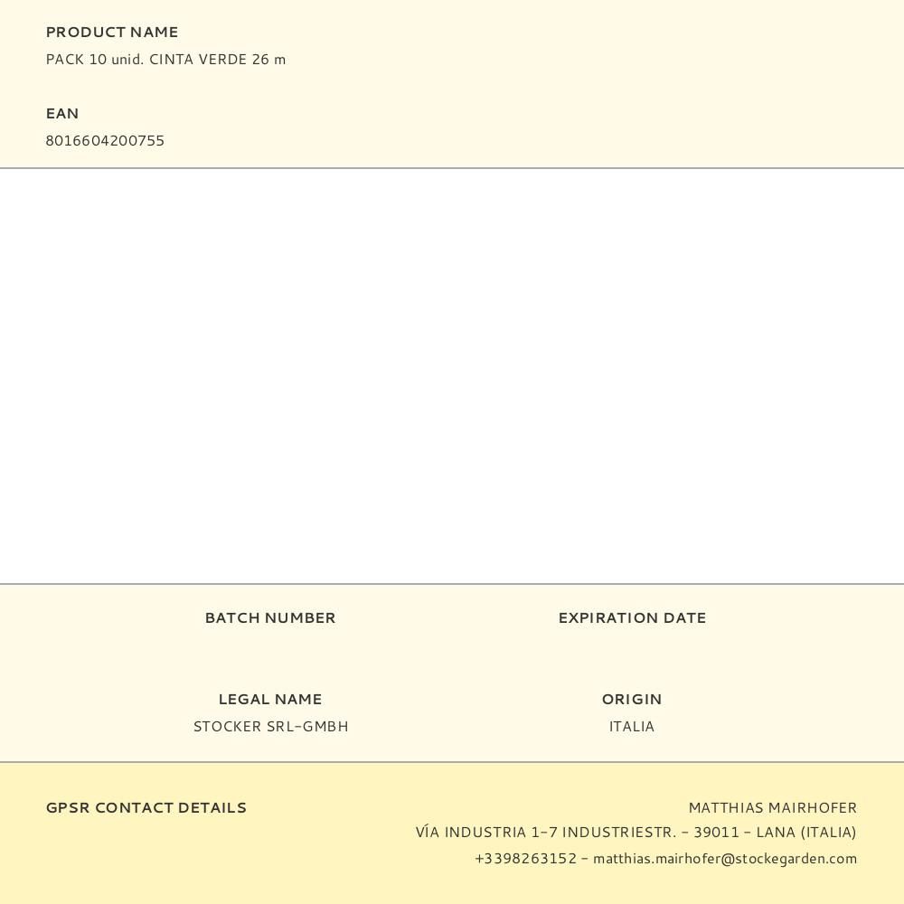 PACK 10 unid. CINTA VERDE 26m .CINTA PARA ATADORA STOCKTAP. LA CINTA DE 26m SE UTILIZA POR SU RESISTENCIA PARA ATAR VIDES JÓVENES O PLANTAS PEQUEÑAS. - CONFECCIÓN DE 10 ROLLOS DE 26m CADA UNO - ESPESOR: 150 MICRAS - COLOR: VERDE. STOCKER
