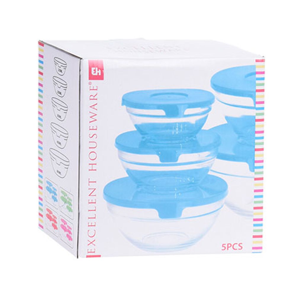 SET 5 FIAMBRERAS DE VIDRIO TIPO BOL COLORES SURTIDOS. APTO PARA MICROONDAS Y CONGELADOR, SURTIDO 4 COLORES. CAPACIDADES: 125 ml, 200 ml, 300 ml, 450 ml, 800 ml
