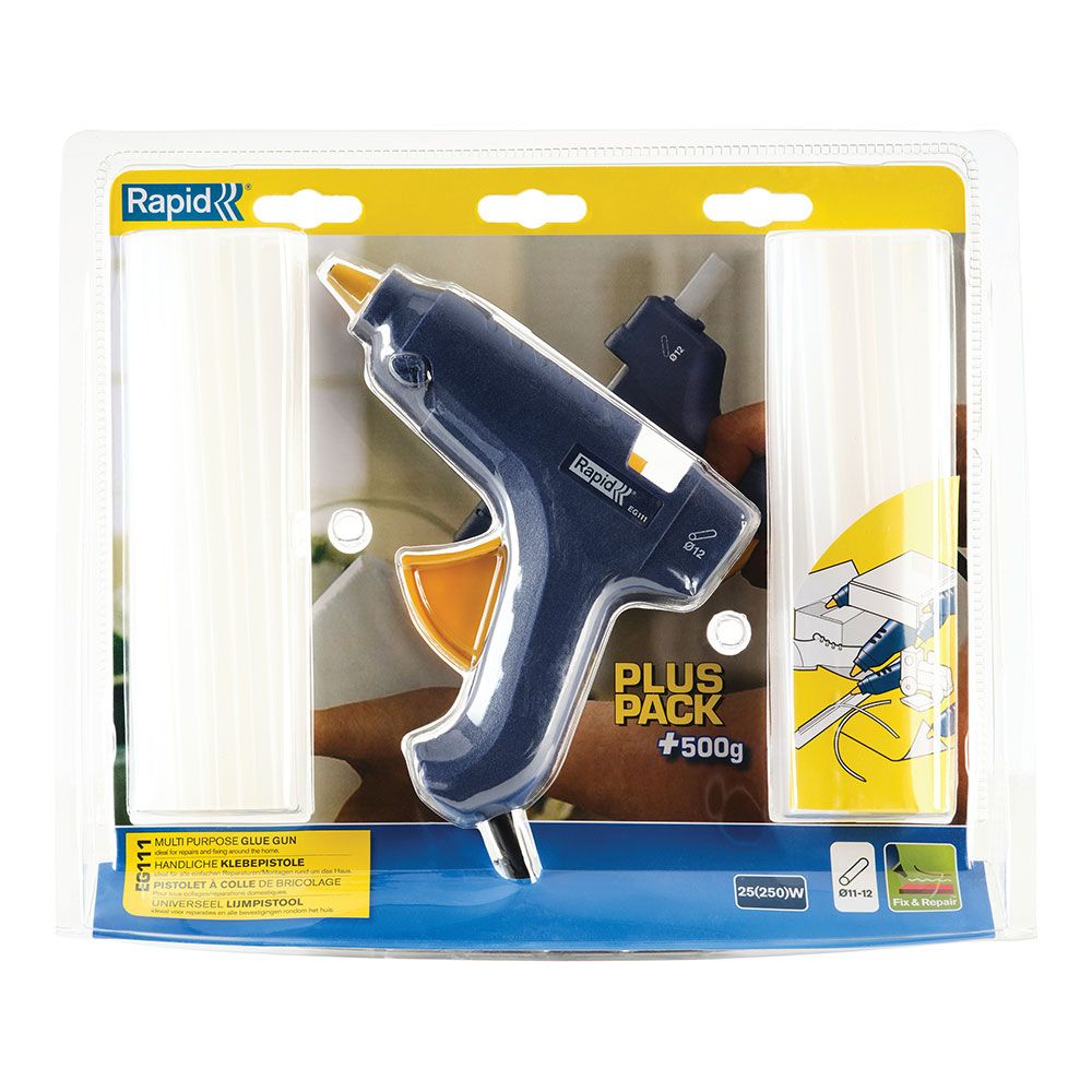 PISTOLA DE COLA EG111 + 500g. COLA TRASPARENTE 40303076 RAPID. CONJUNTO DE PUESTA EN MARCHA QUE INCLUYE 500g DE COLA MULTIUSOS. IDEAL PARA REPARACIONES Y FIJACIONES RÁPIDAS EN EL HOGAR. PARA BARRAS DE COLA DE 12mm. PRODUCCIÓN DE 200g/h DE COLA. TIEMPO DE CALENTAMIENTO DE 10 MINUTOS. SOPORTE AJUSTABLE. INCLUYE 500g DE BARRAS DE COLA MULTIUSOS. 6x32x27cm