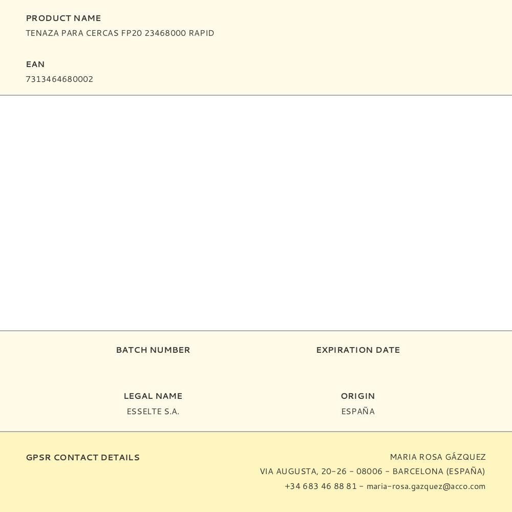 TENAZAS PARA CERCAS FP20, TIENE UNA EMPUÑADURA ERGONÓMICA Y SE PUEDE CARGAR CON GRAPAS ANILLADAS VR16 O VR22, HACIÉNDOLA MUY VERSÁTIL Y CÓMODA DE USAR, NO TIENE CARGADOR, PUES HA SIDO DISEÑADA PARA UN USO DEL MODO MÁS SENCILLO. RESULTA PERFECTA PARA SUJETAR MALLAS DE ALAMBRE AL ALAMBRE DE VALLA. 14,9 x 2,2 x 25,7 cm