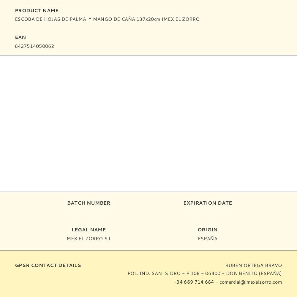 ESCOBA DE HOJAS DE PALMA Y MANGO DE CAÑA 137x20cm. ESCOBA TRADICIONAL RESISTENTE Y FUERTE PARA BARRER LA SUCIEDAD MÁS VOLUMINOSA. IMEX EL ZORRO