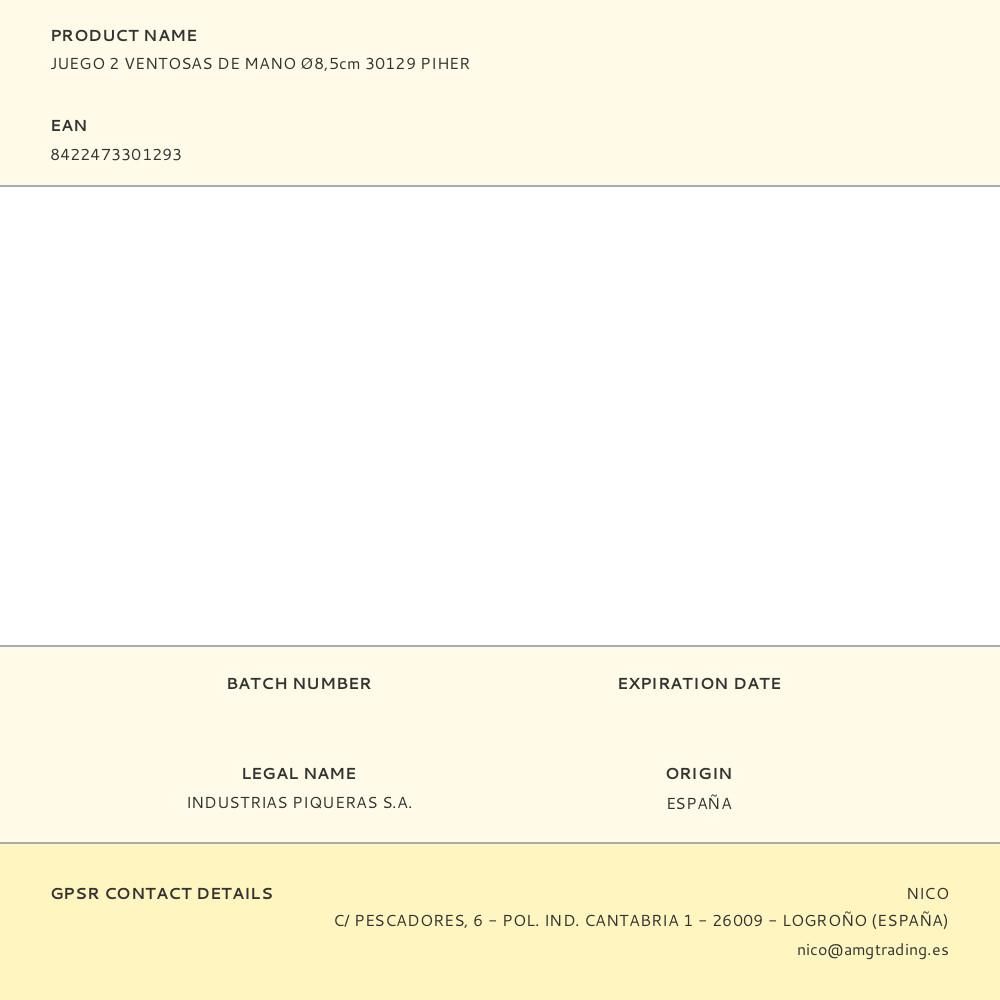 JUEGO 2 VENTOSAS DE MANO Ø8,5cm 30129 PIHER. VENTOSA DE MANO. PREVIENE EL DAÑO DE SUPERFICIES. PARA EL MANEJO DE CRISTAL, BALDOSAS, CHAPAS Y OTROS MATERIALES NO POROSOS. EMPAQUETADO EN 2unid./BLISTER. LOS ARTÍCULOS SON TESTADOS EN NUESTRO DEPARTAMENTO DE CALIDAD.NO APLICA NINGUN NORMA DE SEGURIDAD. ISO: 9001 E ISO: 14001.