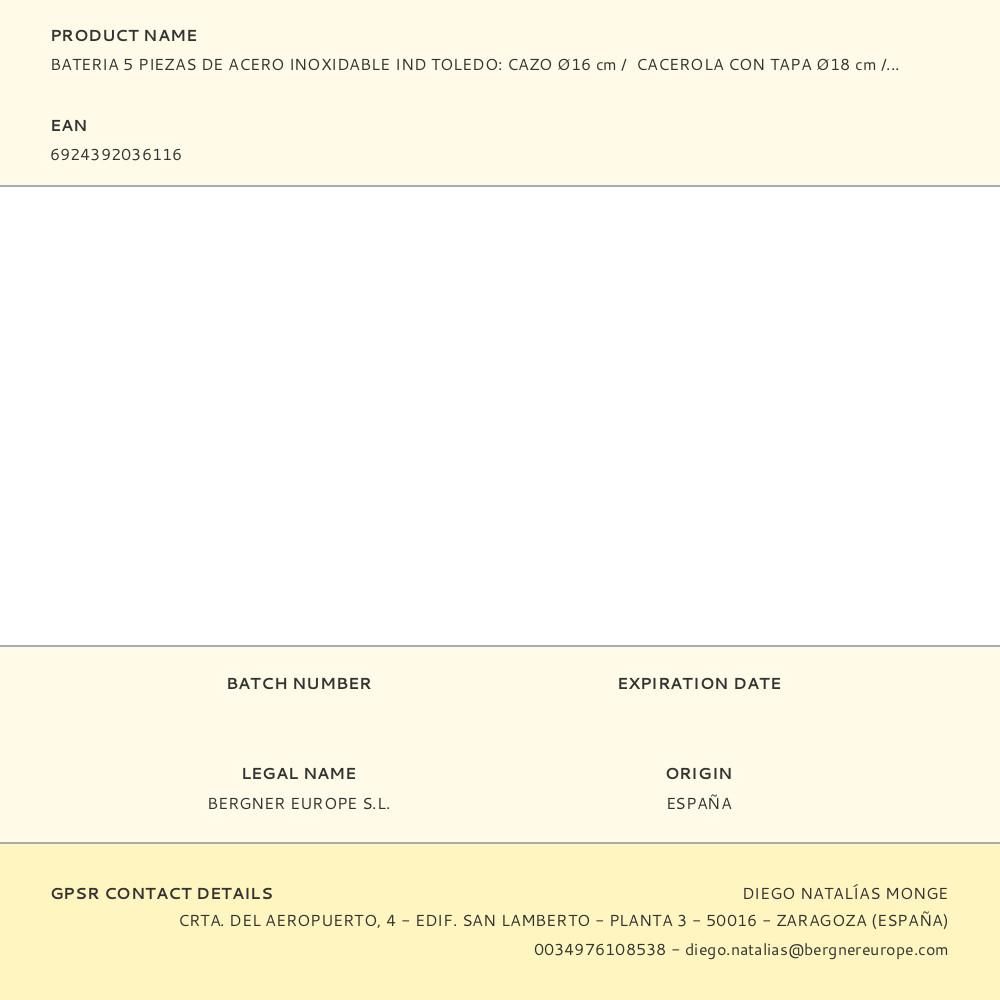 BATERIA 5 unid. ACERO INOXIDABLE IND TOLEDO SG-8050 SAN IGNACIO. SET DE COCINA DE 5 PIEZAS . ACERO INOXIDABLE. CACEROLA SIN TAPA Ø16x9.0cm 1.6l. CACEROLA CON TAPA Ø18x10cm 2.3l. CACEROLA CON TAPA Ø20x11.5cm 3.3l. INDUCCIÓN. INTERIOR BRILLANTE. EXTERIOR BRILLANTE CON DOS LÍNEAS SATINADAS. FORMA RECTA. MANGO NEGRO RESISTENTE AL CALOR. CUERPO CON LOGOTIPO GRABADO
