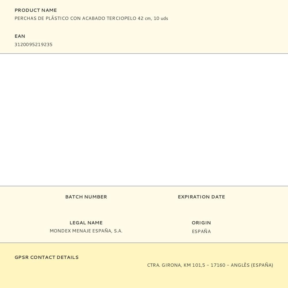 PERCHAS DE PLÁSTICO CON ACABADO TERCIOPELO 42 cm, 10 uds