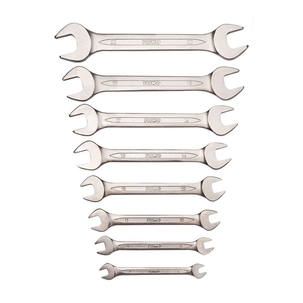 JUEGO DE 8 PIEZAS CON SOPORTE DE PLÁSTICO. COMPONENTES: LLAVES FIJAS DE 6×7 A 20×22mm. ACABADO: CROMADO MATE. MATERIAL: ALEACIÓN DE ACERO DE ALTO RENDIMIENTO. DUREZA: 42-50 HRC. NORMAS: ISO 10102
