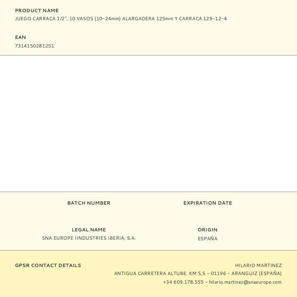 LLAVE DE CARRACA ½ pulg, 10 VASOS 10 - 24 mm, ALARGADERA 125 mm, JUEGO 12 PIEZAS