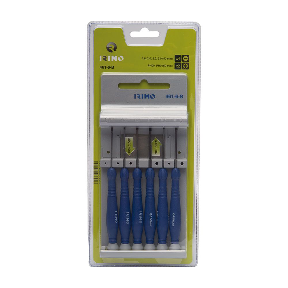 JUEGO 6 DESTORNILLADORES PRECISIÓN. PARA TORNILLOS RANURADOS Y PHILLIPS. RANURADOS: 1,6, 2,0, 2,5 Y 3,0 mm. PHILLIPS: PH0 Y PH00. PUNTA OXIDADA PARA MAYOR PRECISIÓN QUE PROPORCIONA UN AJUSTE PRECISO. TAMAÑO DEL MANGO CÓMODO PARA TRABAJOS DE PRECISIÓN. TAPA GIRATORIA LIBRE PARA UN MANEJO FÁCIL Y PRECISO. HOJA CROMADA PARA ALTA PROTECCIÓN CONTRA LA CORROSIÓN. LA ESTRUCTURA DE PLÁSTICO TIENE UN SISTEMA DESLIZANTE PARA ABRIR Y LIBERAR FÁCILMENTE LA HERRAMIENTA. EN BLÍSTER