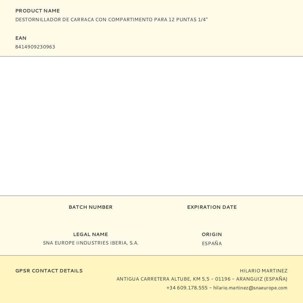 DESTORNILLADOR DE CARRACA CON COMPARTIMENTO PARA 12 PUNTAS ¼ pulg. RANURADOS: 4,0, 5,0 Y 6,0 mm. PHILLIPS: PH1, PH2 Y PH3. -TORX: T15, T20 Y T25. -HEXAGONALES: 3, 4 Y 5 mm. PORTAPUNTAS MAGNÉTICO. MANGO BI-COMPONENTE CON AGARRE SUAVE PARA UNA ALTA TRANSMISIÓN DEL PAR DE APRIETE. LOS DESTORNILLADORES A CARRACA CON 36 DIENTES PERMITEN TRABAJAR CON SUAVIDAD Y CON EL MÍNIMO ARCO DE GIRO PARA LLEGAR AL SIGUIENTE DIENTE DEL GATILLO. GOLPE SUAVE DE LA CARRACA Y MECANISMO DE TRINQUETE DE TRES POSICIONES: HACIA DELANTE, AL REVÉS Y SIGUIENTE DIENTE NEUTRAL DEL GATILLO. VARILLA ESTRIADA QUE APORTA UN AGARRE FIRME Y UN BUEN CONTROL DE LOS DEDOS PARA UN GIRO MÁS RÁPIDO. COMPARTIMENTO PARA ALMACENAR PUNTAS INTERCAMBIABLES CON BOTÓN DE LIBERACIÓN PARA ACCEDER RÁPIDAMENTE A ELLAS. EN BLÍSTER