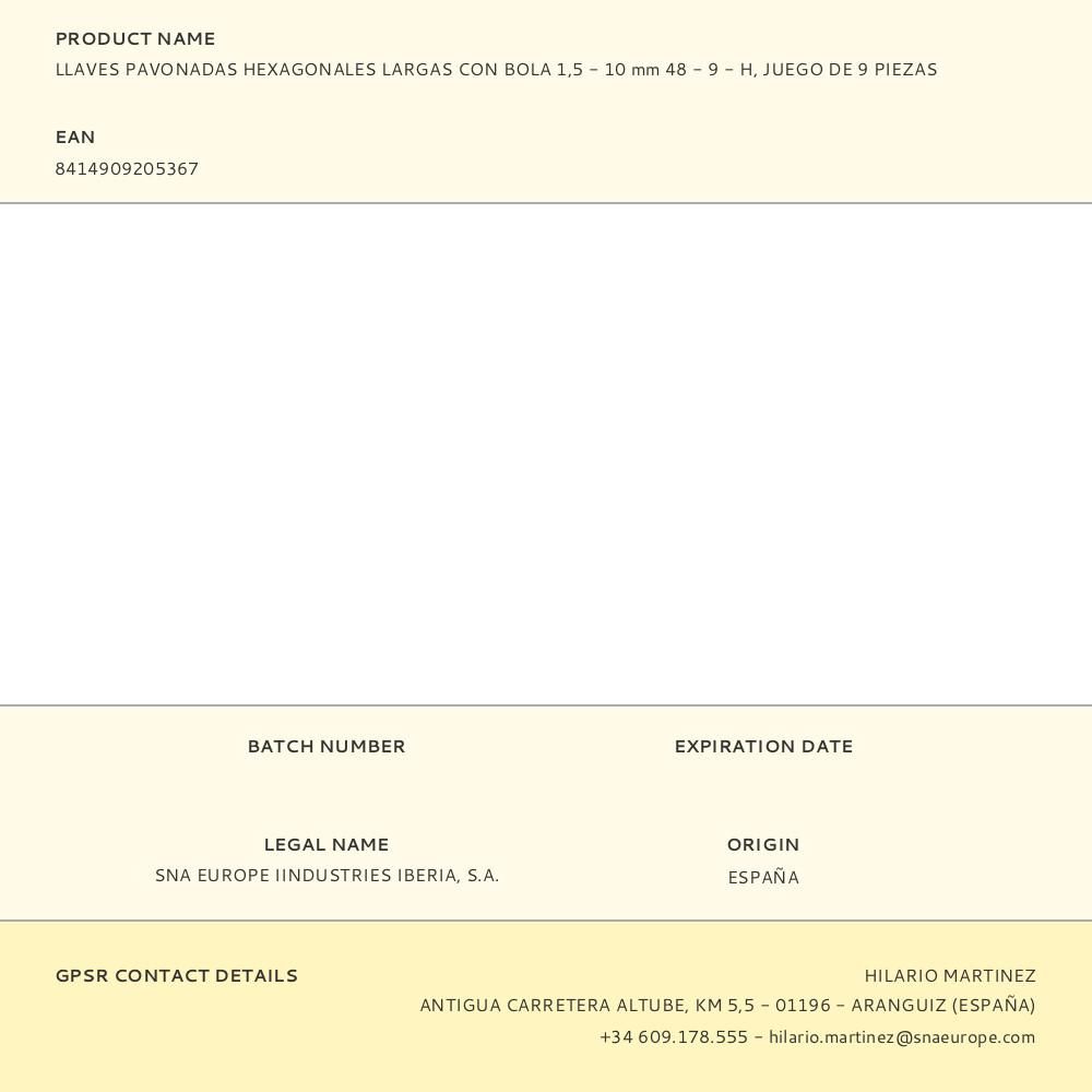 INCLUYE 9 LLAVES TIPO ALLEN CON EXTREMO DE BOLA EN DIMENSIONES MÉTRICAS. MEDIDAS: 1,5, 2, 2,5, 3, 4, 5, 6, 8 Y 10 mm. LLAVE LARGA. CON BOLA HEXAGONAL EN EL BRAZO LARGO. FÁCIL DE INTRODUCIR EN LA CABEZA DEL TORNILLO DESDE VARIOS ÁNGULOS. PARA UN TRABAJO MÁS EFICIENTE Y AHORRO DE TIEMPO. LA LARGA GARRA PROPORCIONA UNA MAYOR TRANSMISIÓN DEL PAR DE APRIETE Y MÁS ACCESIBILIDAD. EL TRATAMIENTO CON ACABADO OXIDADO PROPORCIONA UNA EXCELENTE PROTECCIÓN DE LA SUPERFICIE - MAYOR PRECISIÓN EN LA PUNTA. ACERO DE ALTA CALIDAD, TOTALMENTE TEMPLADO. MEDIDA GRABADA EN LA HOJA PARA UNA FÁCIL IDENTIFICACIÓN. EN SOPORTE DE PLÁSTICO. LOS TAMAÑOS ESTÁN MARCADOS EN EL SOPORTE PARA FACILITAR LA SELECCIÓN. AGUJERO PARA COLGAR
