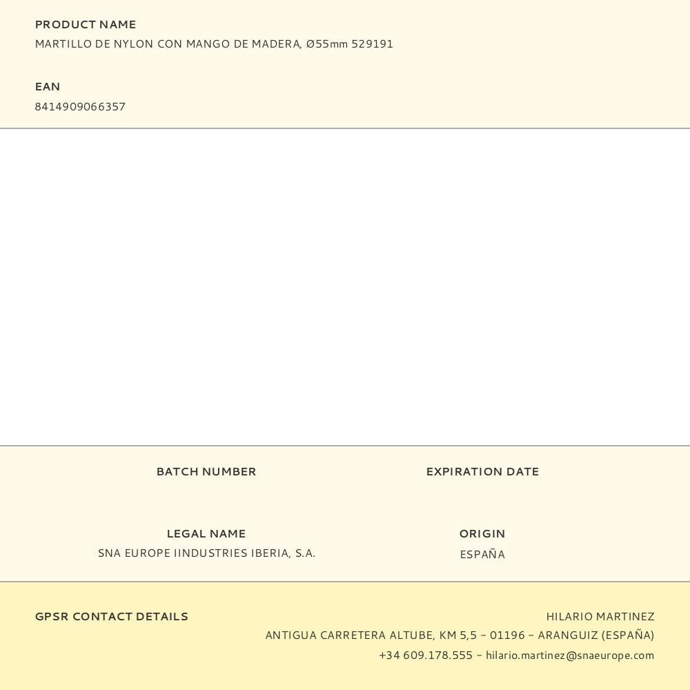 MARTILLO DE NYLON CON MANGO DE MADERA, Ø55 mm. MAZA CON BOCAS DE NYLON EXTENSIBLES. EMBALAJE INDUSTRIAL